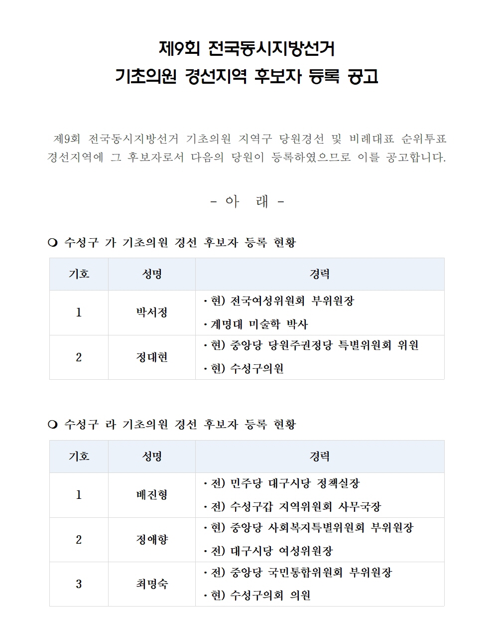 [4/18~19] 제9회 전국동시지방선거 기초의원 (지역구 · 비례대표) 경선 후보자 등록 공고