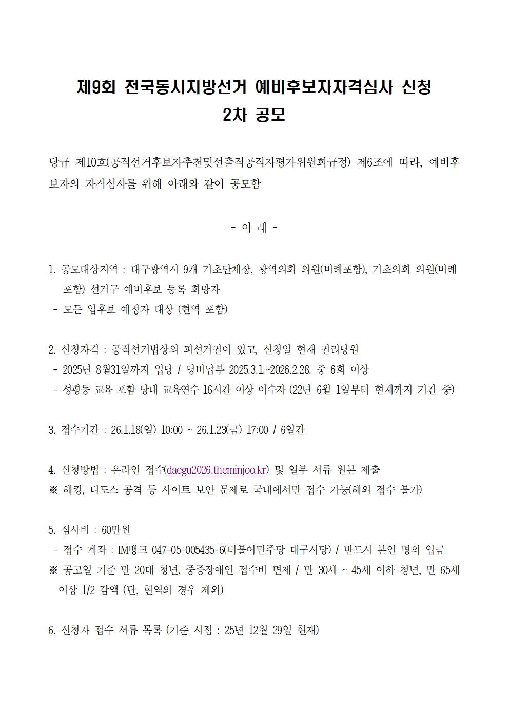 (2차) 제9회 전국동시지방선거 예비후보자자력심사 신청 공모