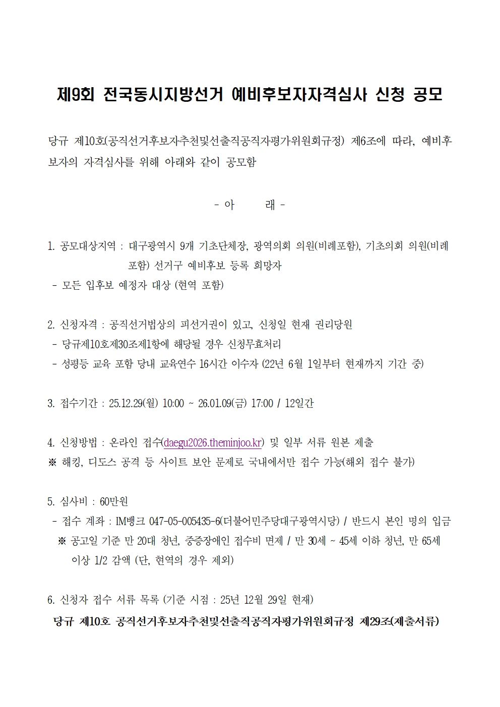 제9회 전국동시지방선거 예비후보자자격심사 신청 공모