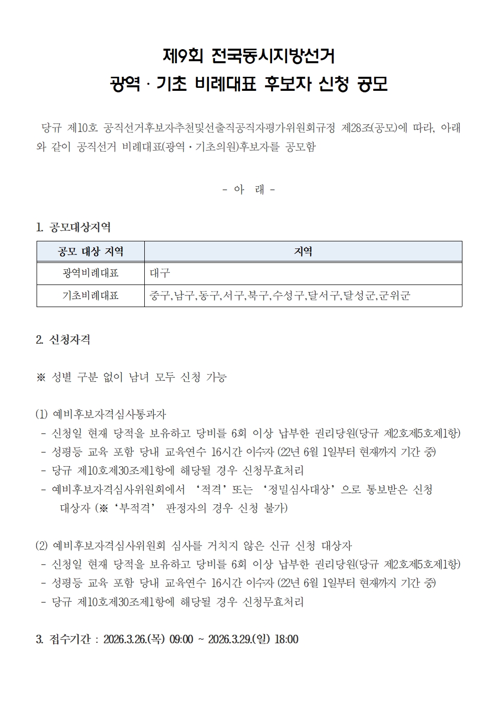 [~3/29] 제9회 전국동시지방선거 광역·기초비례대표 후보자 신청 공모