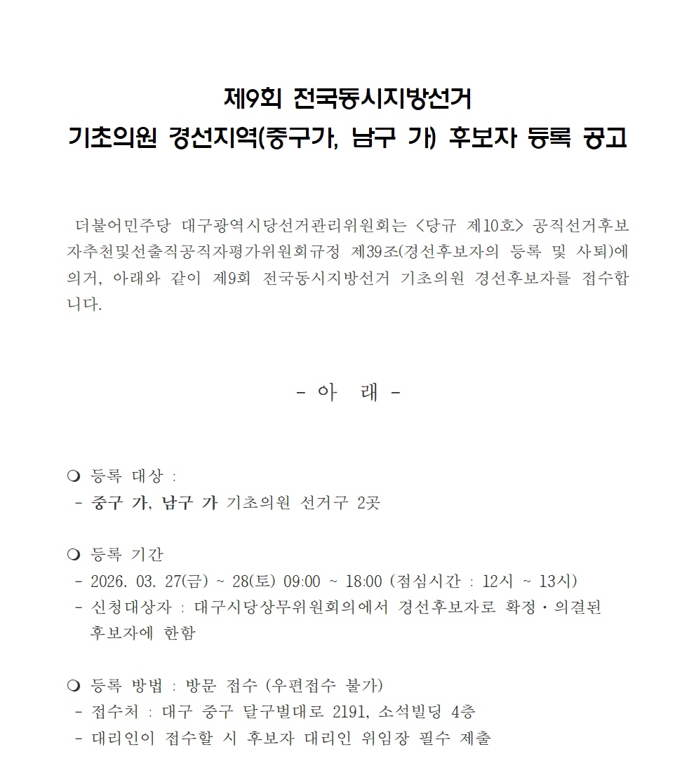 제9회 전국동시지방선거 기초의원 경선지역 (중구 가, 남구 가) 후보자 등록 공고 더불어민주당대구시당 0 143 03.26 16:05 주소 복사 2026.03.26 16:05 [별첨1] 경선 후보자 등록 제출서류.hwp (91.0K) + 13 2026.03.26 16:05 [별첨자료2] 중앙당 ARS투표용 대표경력 허용기준.hwp (108.5K) + 12