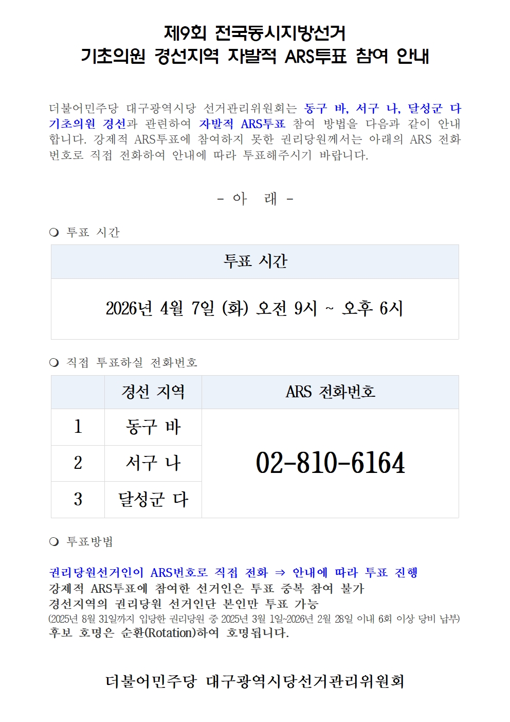 <동구 바, 서구 나, 달성군 다> 기초의원 경선지역 자발적ARS투표 참여 안내