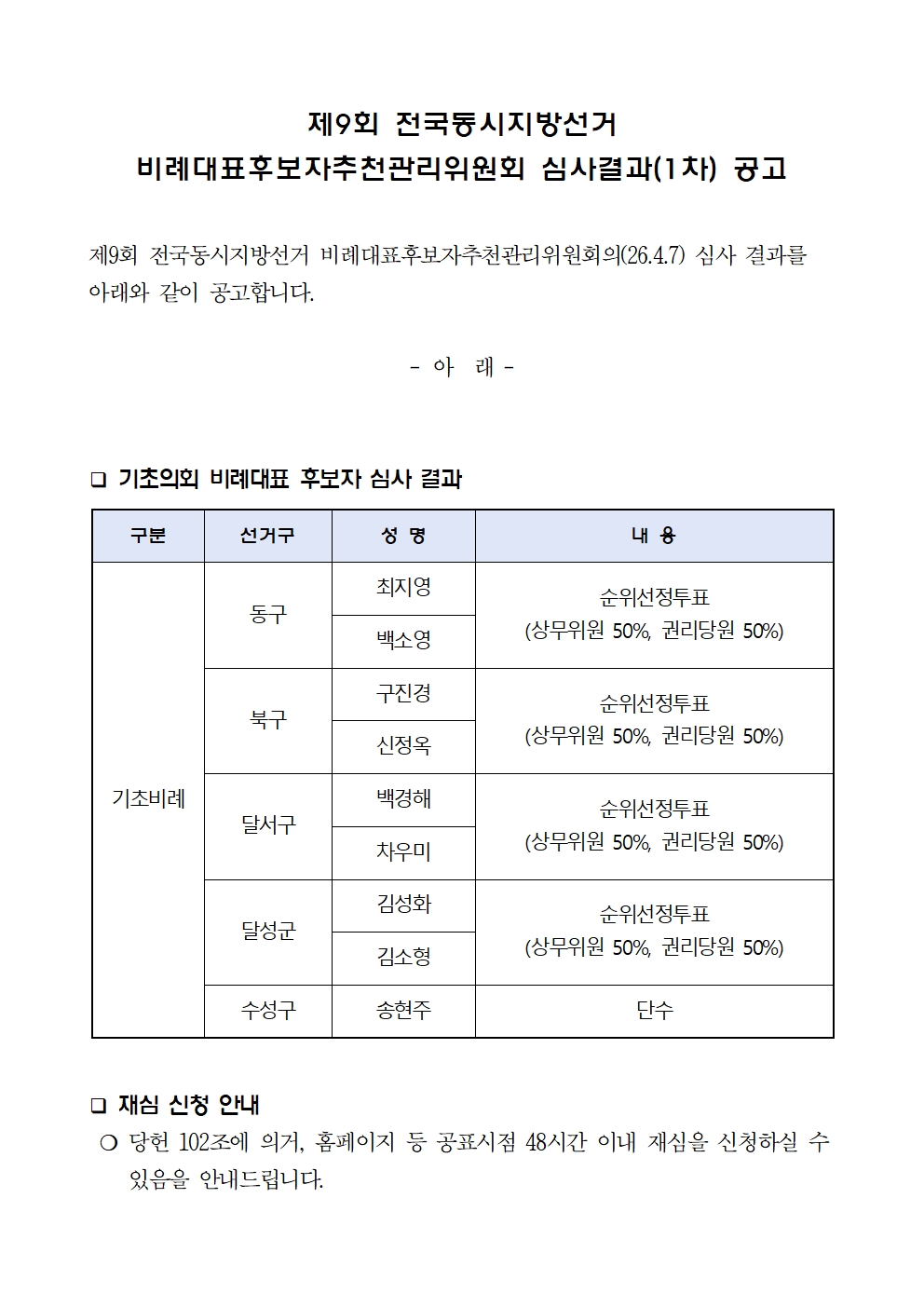 제9회 전국동시지방선거 대구광역시당 비례대표후보자추천관리위원회 심사결과 공고(1차) 더불어민주당대구시당 0 331 04.07 22:40 주소 복사 2026.04.07 22:40 재심신청서_양식.hwp (45.0K) + 4