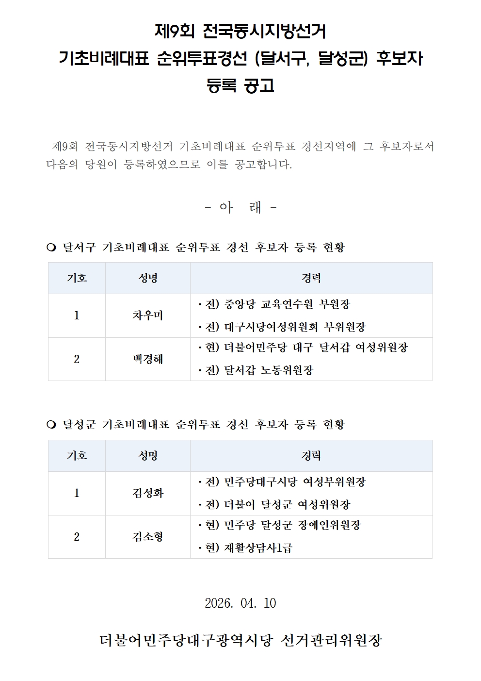 [4/14~15] 제9회 전국동시지방선거 기초비례대표 순위투표경선역 (달서구, 달성군) 후보자 등록 공고