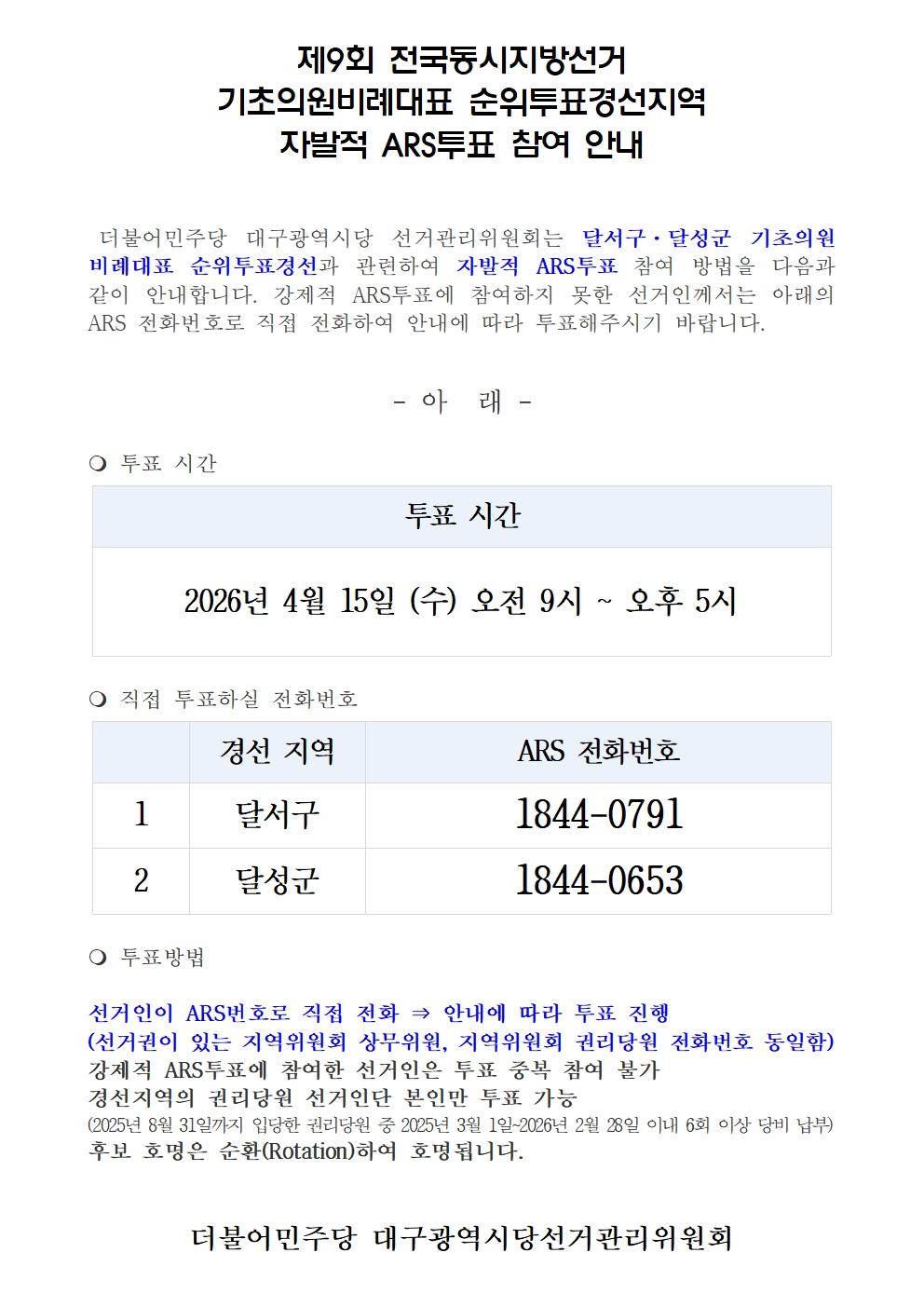 <달서구, 달성군> 기초의원비례대표 순위투표경선 자발적ARS투표 참여 안내