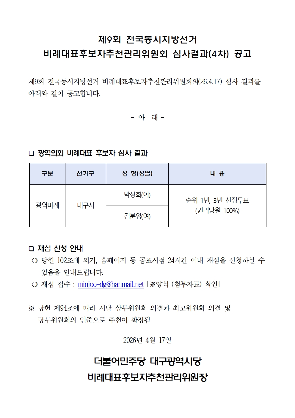 제9회 전국동시지방선거 대구광역시당 비례대표후보자추천관리위원회 심사결과 공고(4차) 더불어민주당대구시당 0 157 04.17 17:53 주소 복사 2026.04.17 17:53 재심신청서_양식.hwp (45.0K) + 3