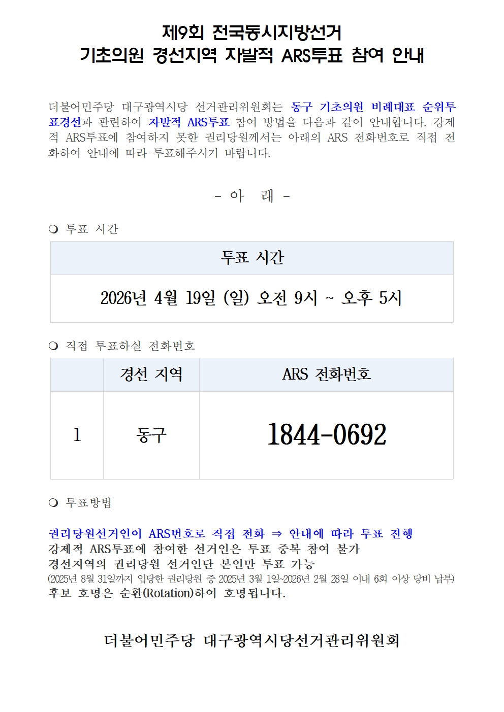 <동구> 기초의원비례대표 순위투표경선 자발적ARS투표 참여 안내