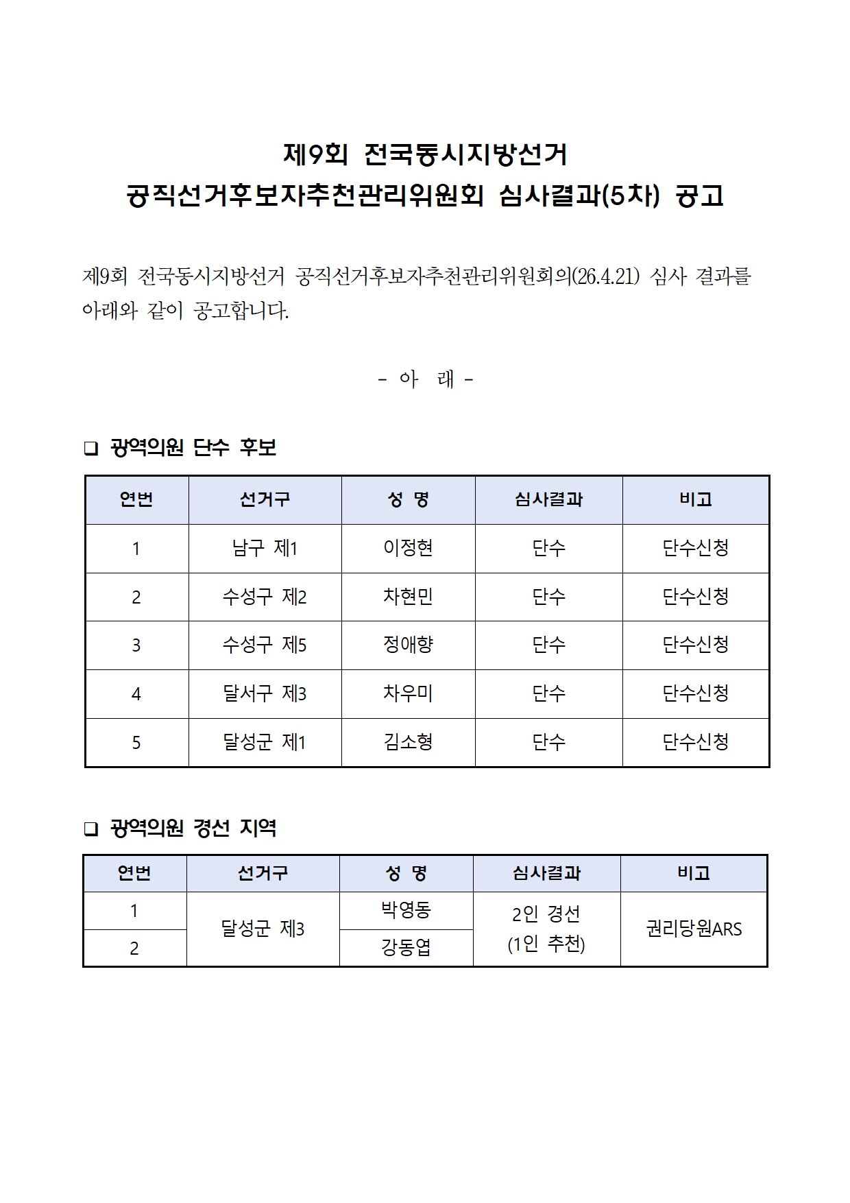 제9회 전국동시지방선거 대구광역시당 공직선거후보자추천관리위원회 심사결과(5차) 공고 더불어민주당대구시당 0 138 2시간전 주소 복사 2026.04.21 19:36 260219_재심신청서_양식_ 1.hwp (45.0K) + 2