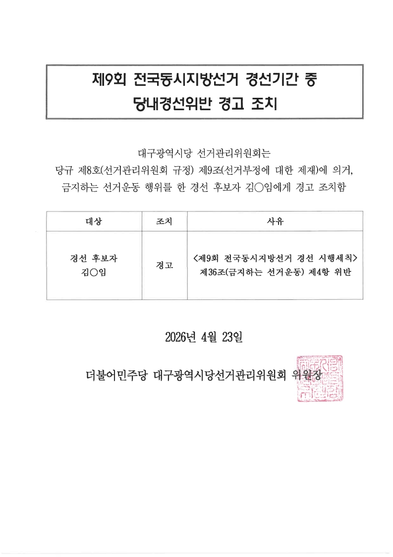 [4/23] 제9회 전국동시지방선거 경선기간 중 당내경선위반 경고 조치