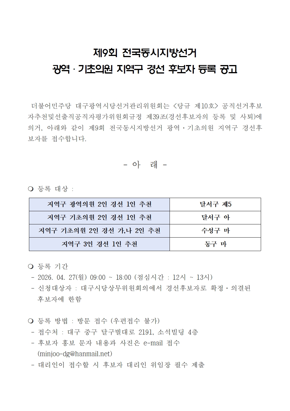 [4/27] 제9회 전국동시지방선거 광역·기초의원 지역구 경선 후보자 등록 공고 더불어민주당대구시당 0 340 04.26 21:21 주소 복사 2026.04.26 21:21 [별첨1] 경선 후보자 등록 제출서류.hwp (91.0K) + 19 2026.04.26 21:21 [별첨자료2] 중앙당 ARS투표용 대표경력 허용기준.hwp (108.5K) + 5 등록 방법 : 방문 접수 (우편접수 불가)- 접수처 : 대구 중구 달구벌대로 2191, 소석빌딩 4층- 후보자 홍보 문자 내용과 사진은 e-mail 접수(minjoo-dg@hanmail.net)- 대리인이 접수할 시 후보자 대리인 위임장 필수 제출