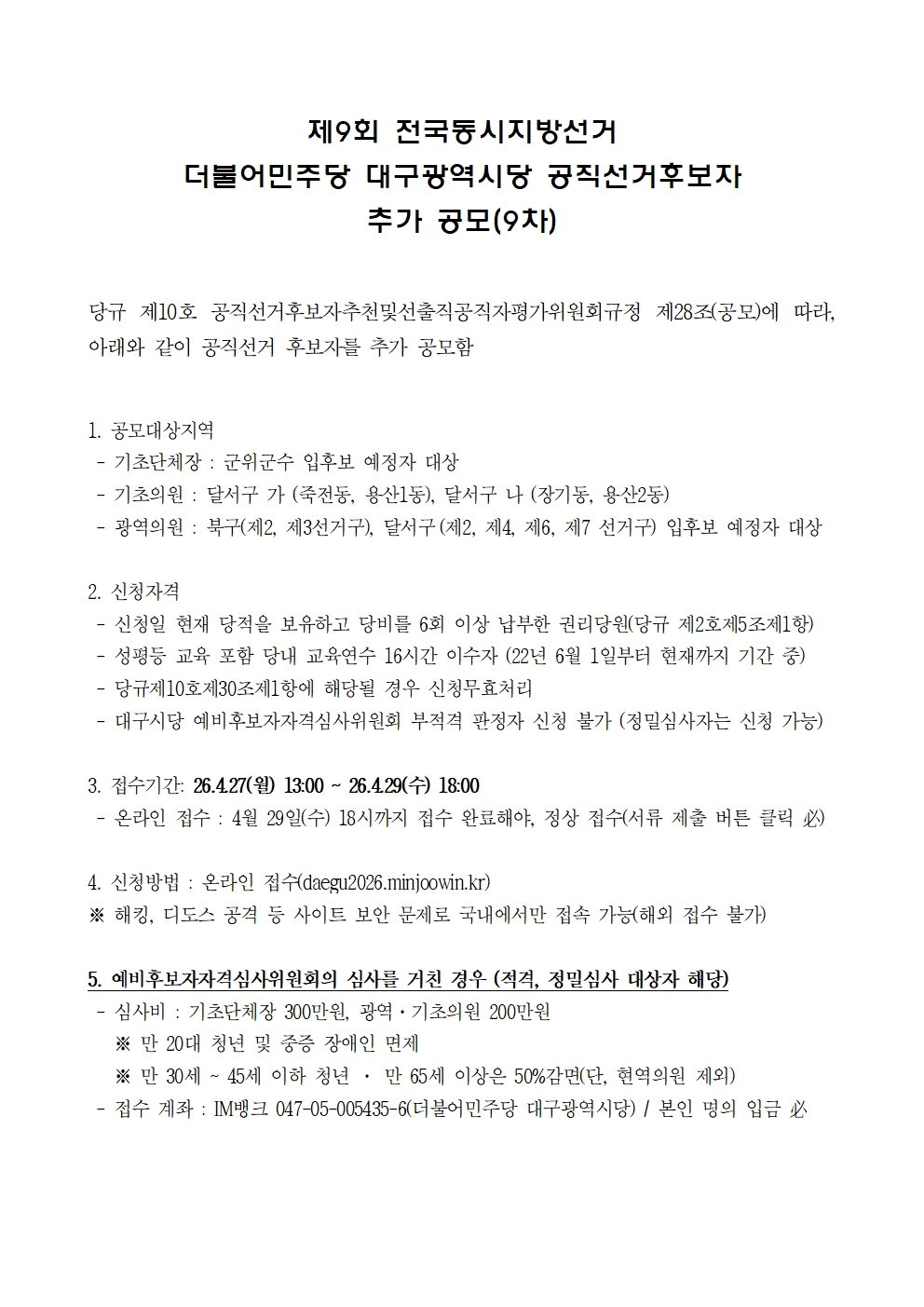 [추가 공모] 제9회 전국동시지방선거 더불어민주당 대구광역시당 공직선거후보자 추가 공모(9차)