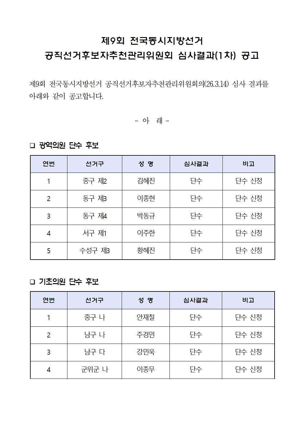 제9회 전국동시지방선거 대구광역시당 공직선거후보자추천관리위원회 심사결과(1차) 공고 더불어민주당대구시당 0 1210 03.14 19:52 주소 복사 https://www.theminjoodaegu.co.kr/data/editor/2603/4cadc861f601d4150882… + 2 2026.03.14 19:52 재심신청서_양식__.hwp (45.0K) + 21