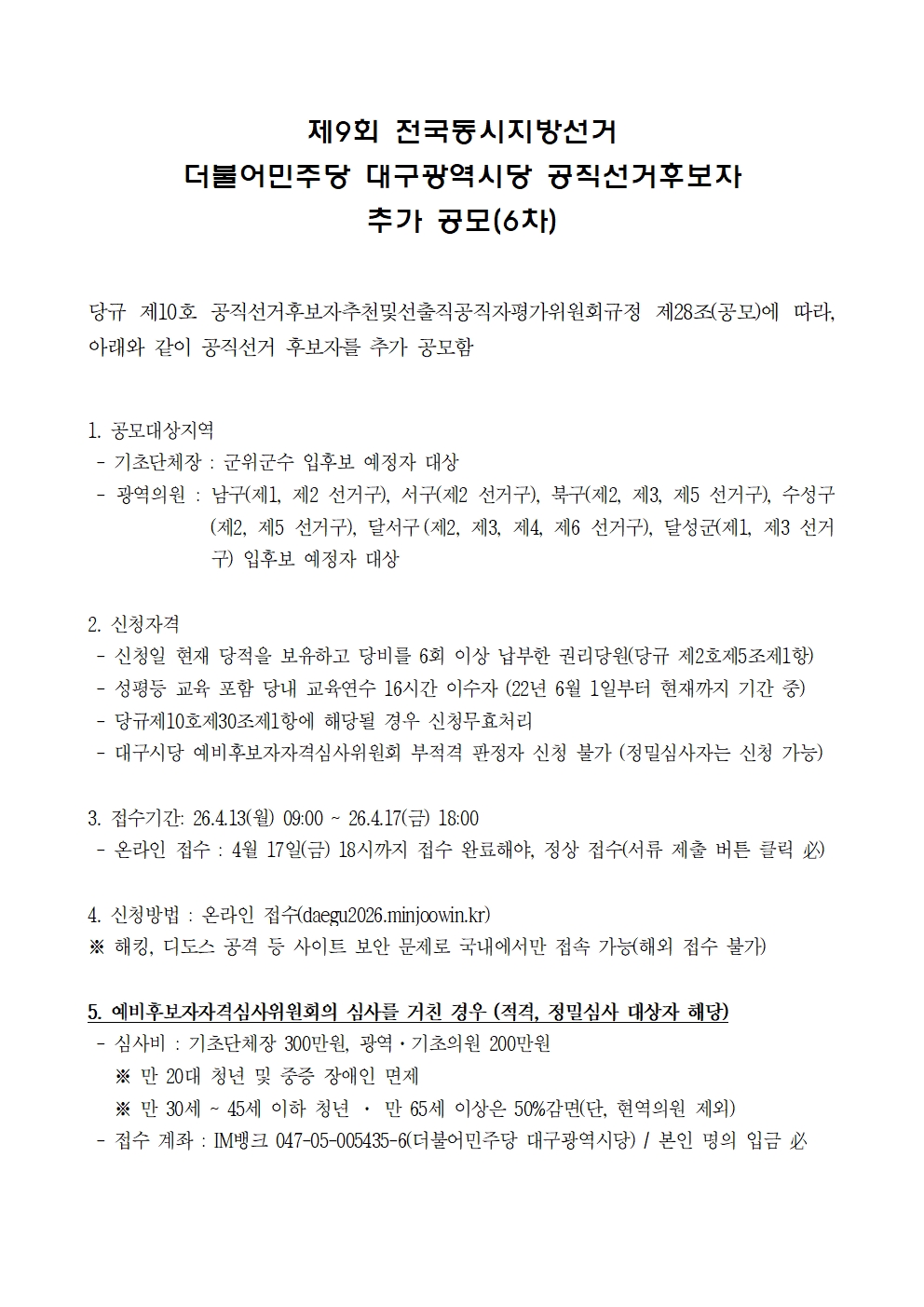 [추가 공모] 제9회 전국동시지방선거 더불어민주당 대구광역시당 공직선거후보자 추가 공모(6차)