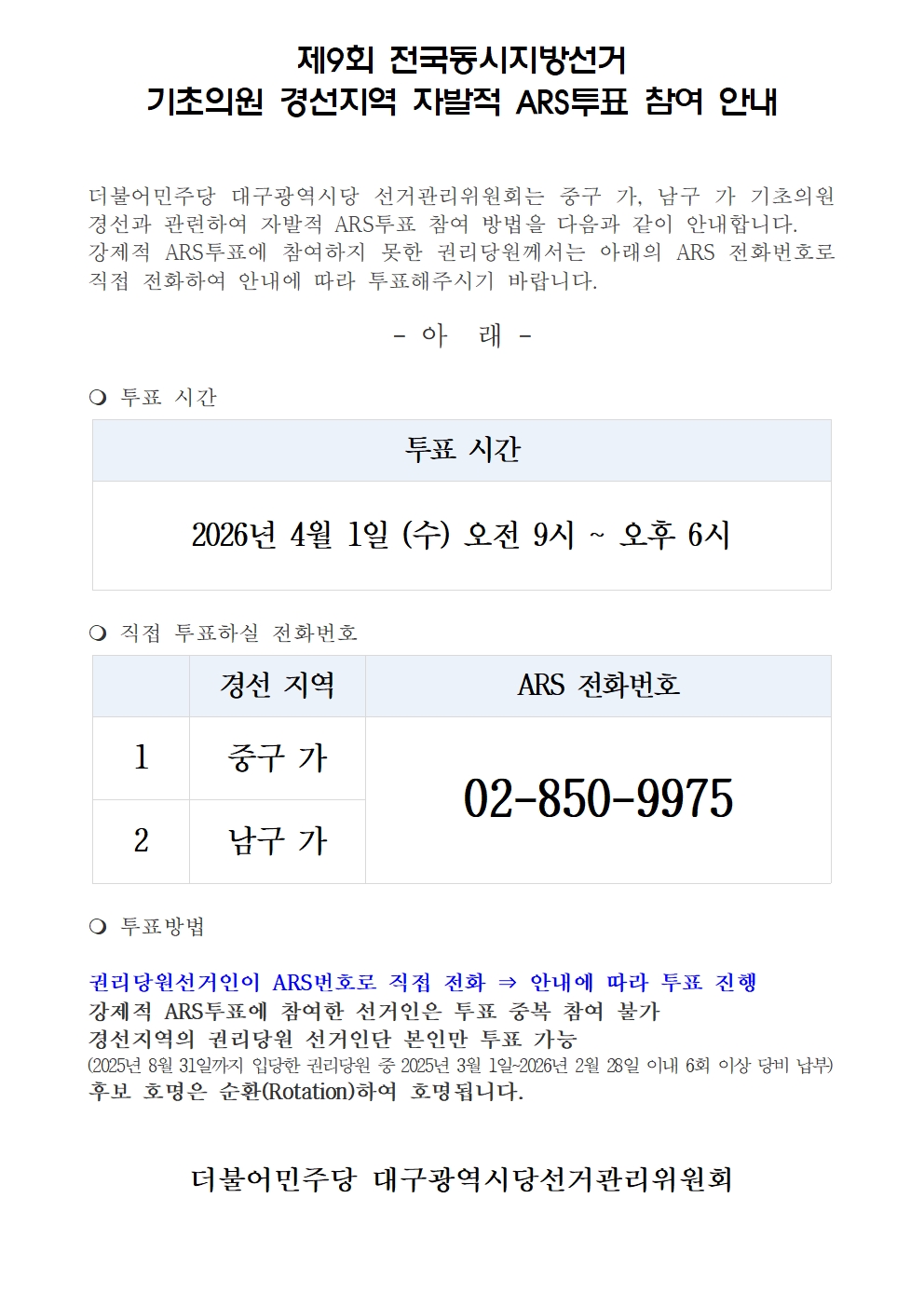 <중구 가, 남구 가> 기초의원 경선지역 자발적 ARS투표 참여 안내