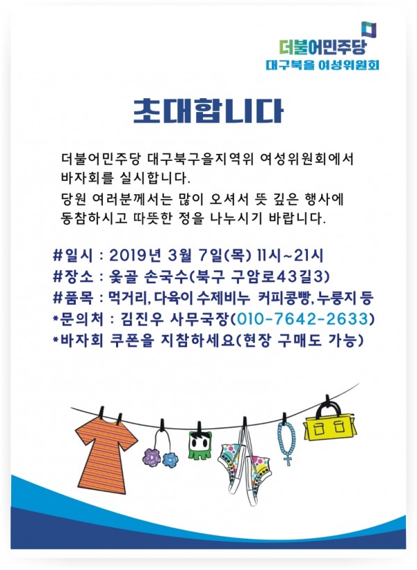 북구을 여성위원회, "이웃사랑 사랑의 바자회" 개최 김진우 북구을 0 5339 2019.03.05 10:32 주소 복사 <알립니다>안녕하십니까? 대구북구을지역위원회여성위원장 김효원입니다.3월 7일(목) 오전 11시부터 밤 9시까지 당원님들을 모시고 바자회를 하고자 합니다. 수익금 전액을 기부하는 행사이오니 우리 당원님들의 적극적인 협조 부탁드립니다.*바자회 쿠폰 구입문의김진우 사무국장( ☎ 010-7642-2633 )