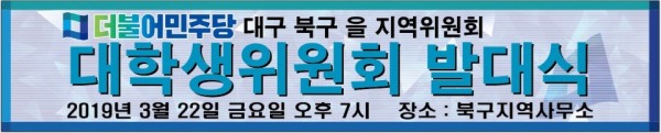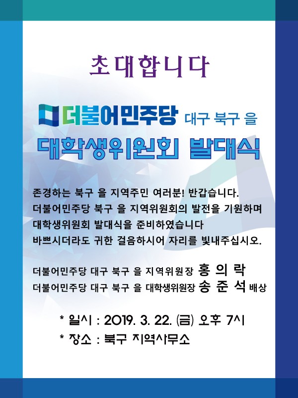 북구을 대학생위원회 발대식 김진우 북구을 0 5171 2019.03.20 15:50 주소 복사 대구시 당원 여러분 안녕하십니까.북구을지역위 대학생위원회가 아래와 같이 새롭게 출발합니다.많이 참석하셔서 힘차게 출발하는 우리당을 짊어질 북구을 대학생위원회를 격려해주시기 바랍니다.
