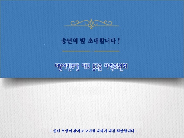 20181227-동구을송년의밤 최완식 동구을 0 6879 2019.01.23 22:53 주소 복사 [ 송년의 밤 이모저모 ]추운 날씨와 많은 일정에도 불구하고 참석하여 자리를 빛내 주신 당원 동지분들께 감사드립니다.참석은 못했지만, 전화등 다양한 방법으로 연락주셔서 감사합니다. 아무런 사고없이 잘 진행되었습니다.한해를 잘 마무리하고 새해를 맞이하시길 기원드립니다.감사하겠습니다.더불어민주당 대구동구을 지역위원회 #더불어민주당 #대구동구을지역위원회 #이승천위원장 #바꿔내자_2020! #제대로_일하자!