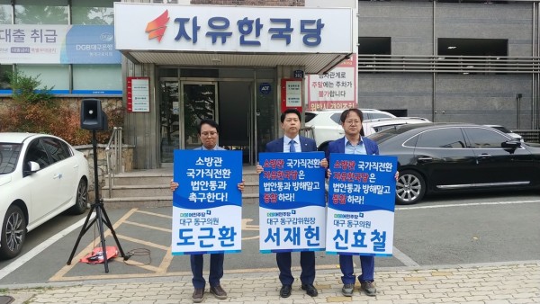 2019. 05.15. 09:10부터 30분간 서재헌 동구갑지역 위원장과 도근환, 신효철 의원이 주민의 안전과 직결되는 소방관 국가직전환 통과를 위한 촉구를 자유한국당 대구시당 당사앞에서 했습니다.
